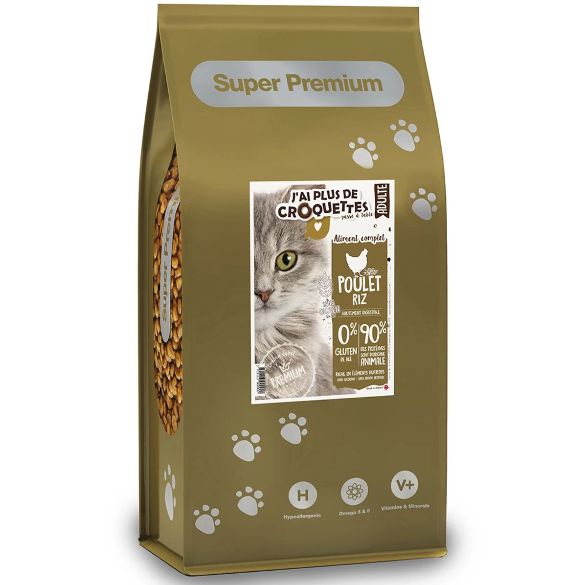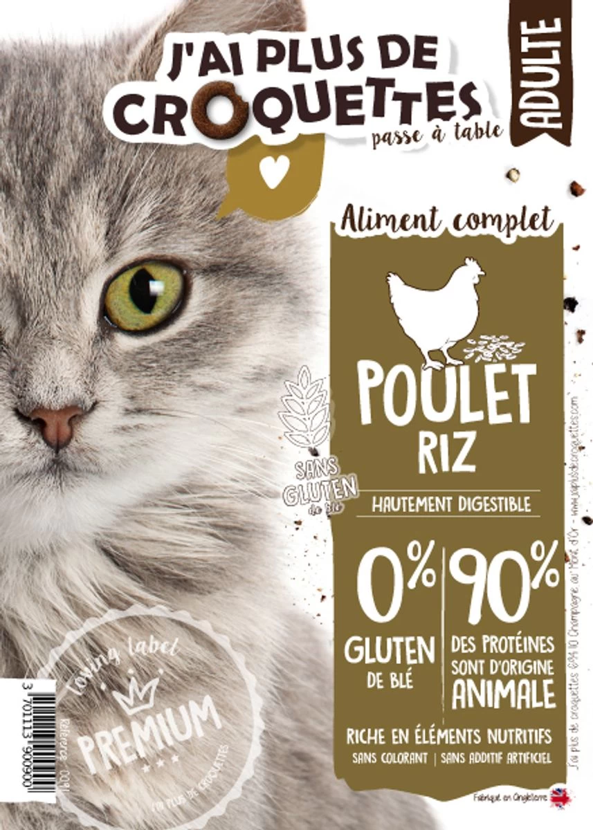 50 % de poulet (dont 38 % poulet déshydraté, 10 % de graisse de poulet et 2 % de sauce au poulet), riz (21 %), maïs, pulpe de betterave (4 %), œuf déshydraté, levure de bière, supplément d’oméga-3, cellulose (0,5 %), minéraux, sel, Fructooligosaccharides (FOS, 480 mg/kg), Mannanoligosaccharides (MOS, 120 mg/kg).