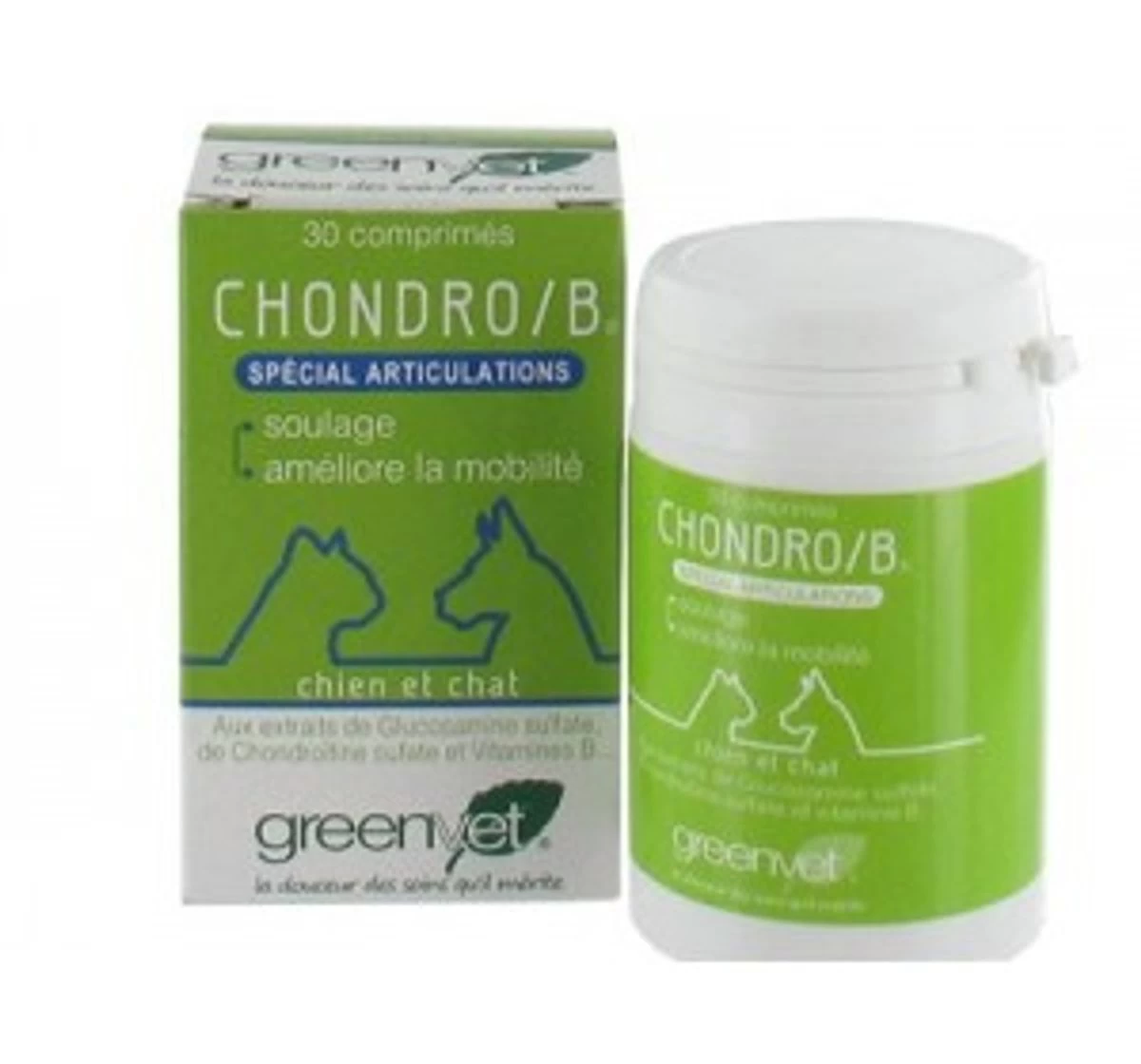 | Chondroïtine sulfate……….. 200mg Glucosamine sulfate……….. 300mg Thiamine B1…………………. 12.5mg Pyridoxine B6………………… 12.5mg Cyanocobalamine……………. 35mcg Anti-oxydants : polyphénols de raisin. Comprimés appétents goût viande. |