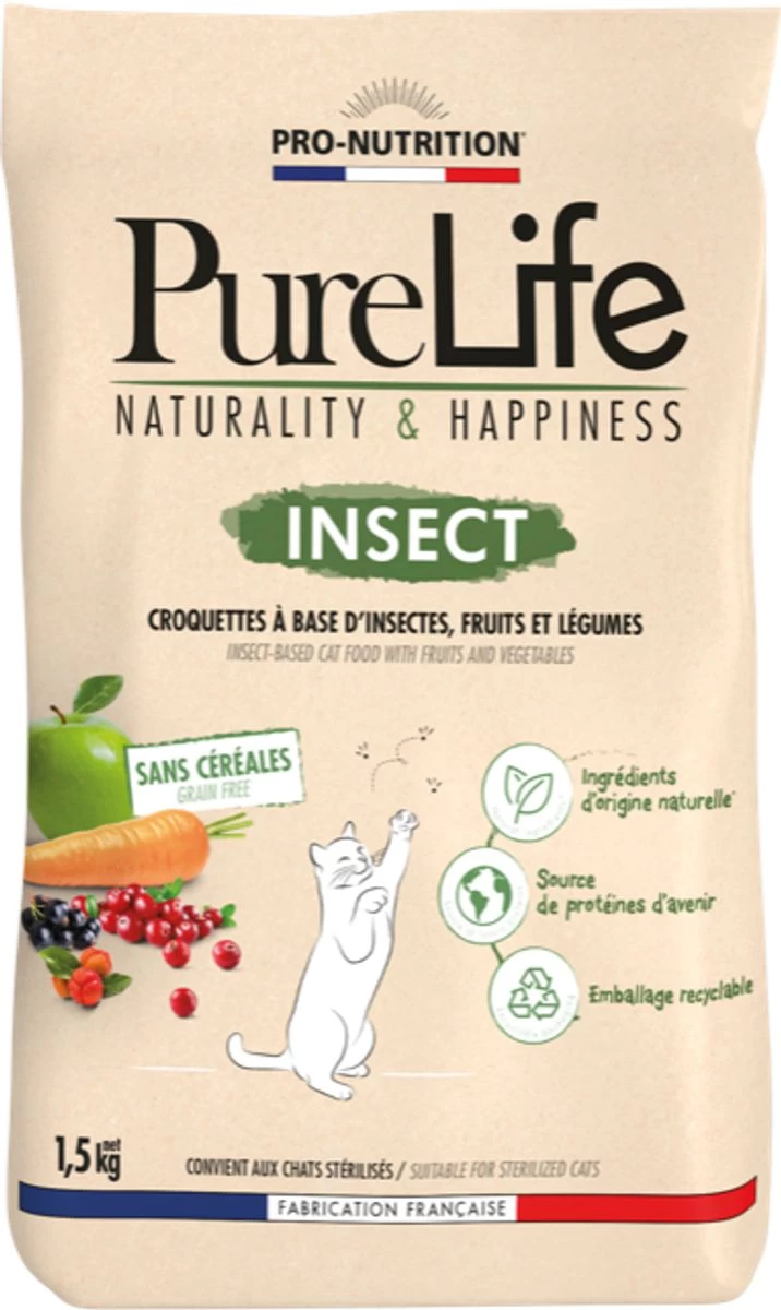 Parce qu’il aime chasser, le chat est naturellement attiré par les insectes, qu’il va attraper pour jouer et se nourrir. C’est donc dans le régime alimentaire naturel du chat que l’on retrouve les insectes. Pure Life Insect est une croquette complète et équilibrée, adaptée aux besoins naturels de votre chat. C’est une sélection rigoureuse de chaque ingrédient pour qu’il soit de haute qualité nutritionnelle, pour le bien-être de votre chat, pour qu’il reste en bonne santé.