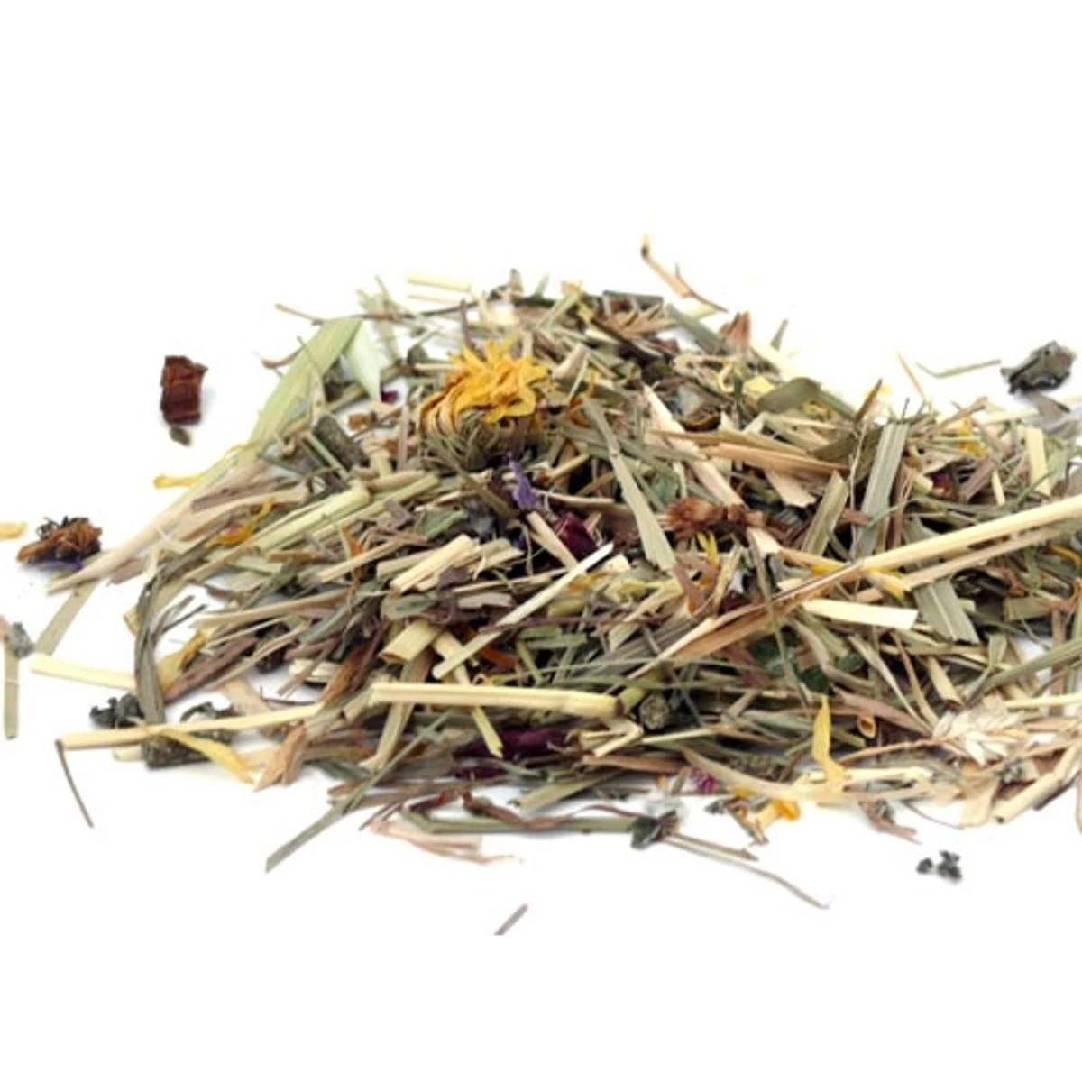 Foin, blé complet, luzerne, pomme, feuille de pissenlit, prêle des champs, orge, châtaigne, tige de framboisier, aigremoine eupatoire, pissenlit, prébiotiques et probiotiques naturels, feuille de framboisier.