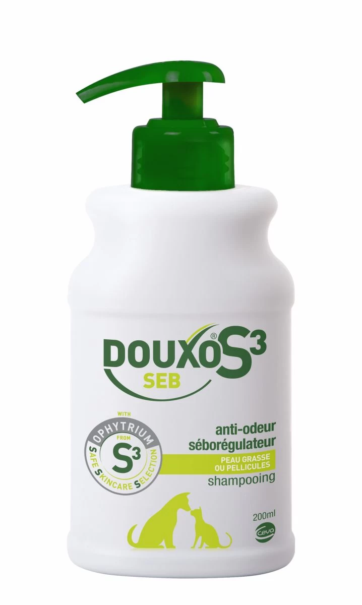 Ce shampoing Douxo Seb au parfum thé vert, vise à rétablir l’équilibre cutanée en cas de pathologies cutanées dues à un excès de sébum (séborrhée) du chien et du chat.