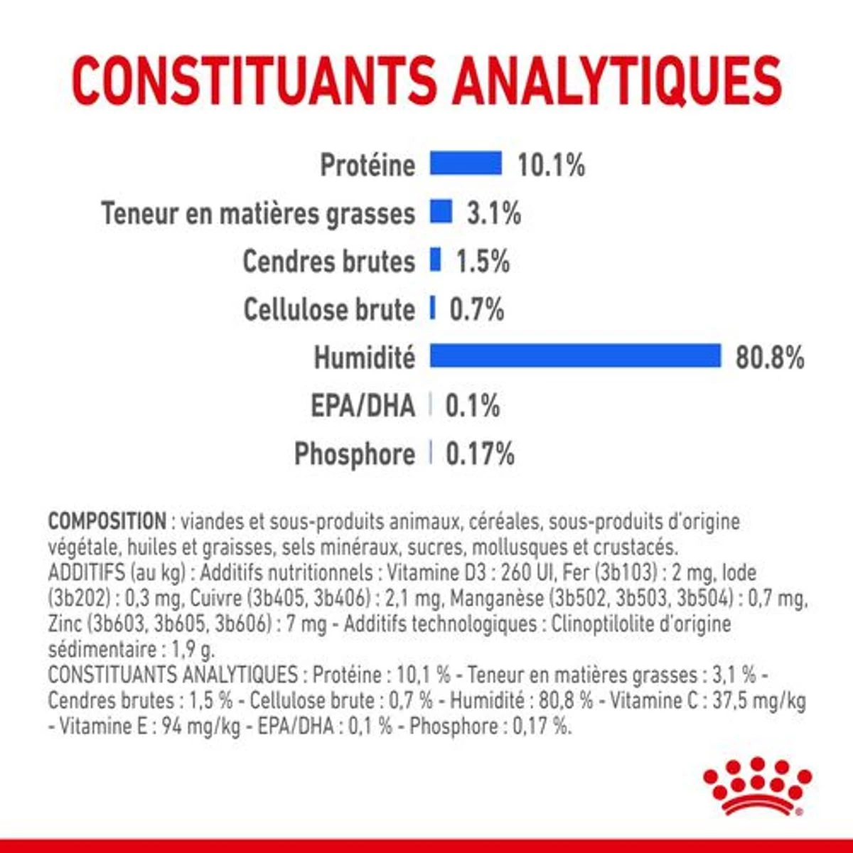 – Constituants analytiques : Protéine : 10,1 % – Teneur en matières grasses : 3,1 % – Cendres brutes : 1,5 % – Cellulose brute : 0,7 % – Humidité : 80,8 % – Vitamine C : 37,5 mg/kg – Vitamine E : 94 mg/kg – EPA/DHA : 0,1 % – Phosphore : 0,17 %.