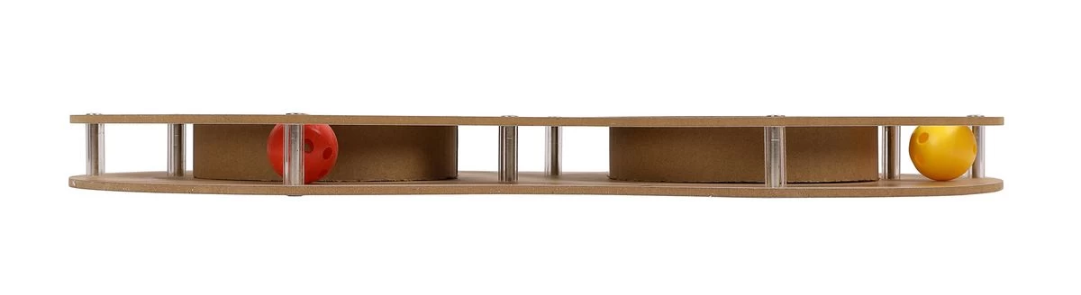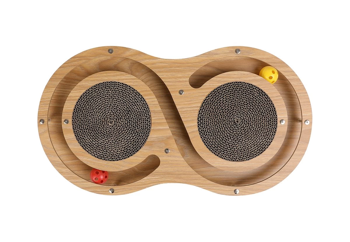 – 2 balles colorées circulant autour du griffoir en carton grâce aux couloirs