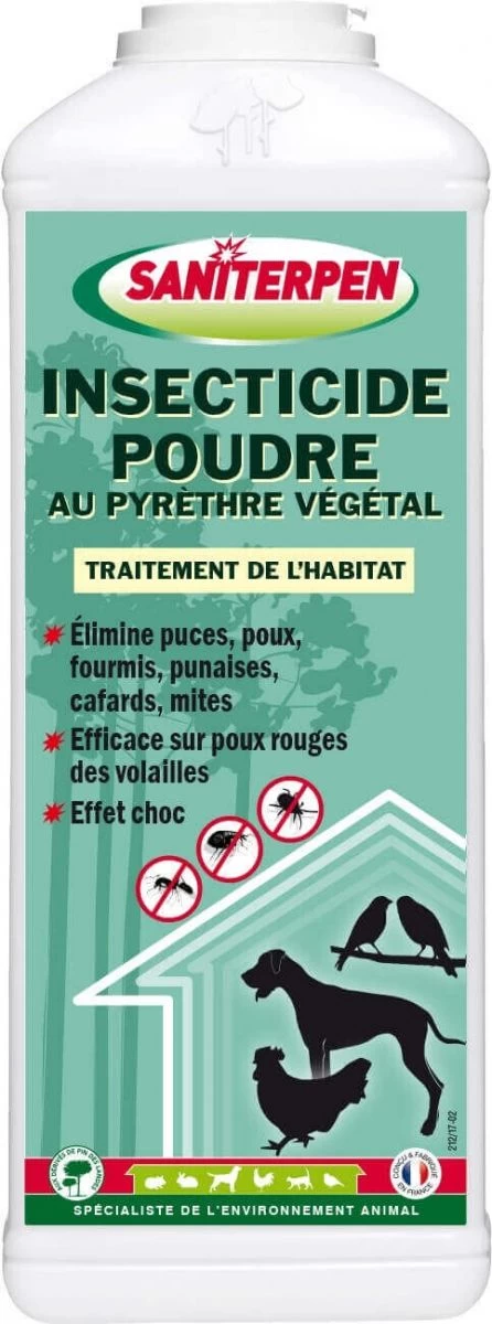 Saniterpen Insecticide Poudre au Pyrèthre Végétal est efficace contre les poux, tiques, puces, cafards, mites, punaises ! Pratique, il s’utilise à sec et ne tache pas.