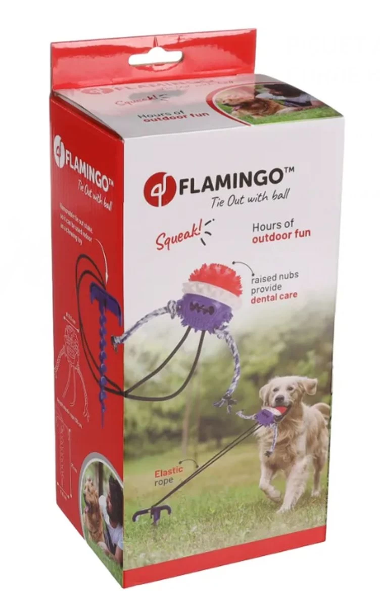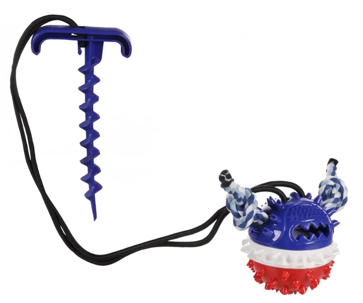 Ce jouet pour chien est un piquet avec un cordon et une balle qui possède une pointe de terre pour ancrer le jouet dans le sol.
