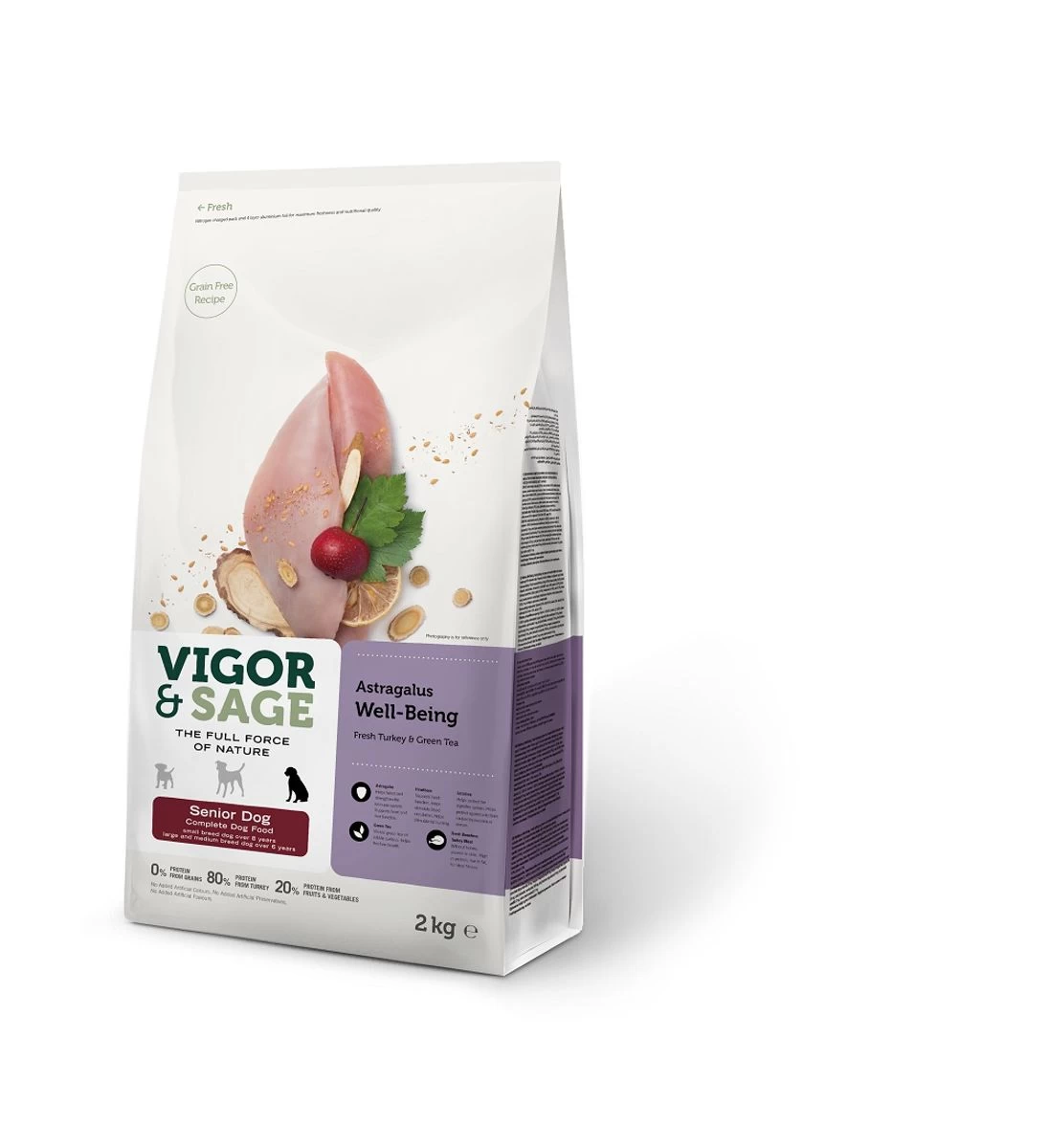 Caractéristiques des croquettes Poulet / Astragale / algues marines de Vigor & Sage pour chien senior :