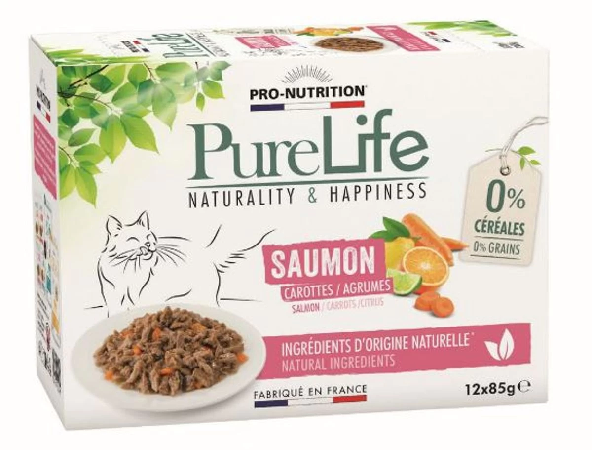 Pure Life Chat est une gamme de délicieux éffilés en sauce formulés sans céréales, avec des ingrédients d’origine naturelle, pour le bien-être et le plaisir de votre chat. 90% de protéines sont d’origine animale.