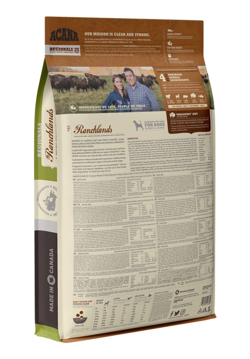 Boeuf Angus frais (8%), agneau nourri à l’herbe cru (7%), porc Yorkshire frais (7%), boeuf déshydraté moulu (7%), agneau déshydraté moulu (7%), porc déshydraté moulu (7%), petits pois entiers, lentilles rouges entières, pois chiches entiers, gras de boeuf (5%), foie de boeuf frais (4%), foie de porc frais (4%), bison frais (4%), doré jaune sauvage frais (4%), lentilles vertes entières, haricots Pinto entiers, pois jaunes entiers, luzerne séchée au soleil, rognons de boeuf frais (2%), huile de lieu jaune (2%), fibres de lentilles, cartilages de boeuf séchés (1%), tripes d’agneau crues (1%), varech brun séché, citrouille fraîche, courge musquée fraîche, panais frais, chou vert frais, épinards frais, feuilles de moutarde fraîches, feuilles de navet fraîches, carottes fraîches, pommes Red Delicious fraîches, poires Bartlett fraîches, foie lyophilisé (boeuf, agneau et porc) (0,1%), canneberges fraîches, myrtilles fraîches (bleuets), racine de chicorée, curcuma, chardon Marie, bardane, lavande, racine de guimauve, fruits de l’églantier.Additifs : Vitamine E, zinc et cuivre.Conservé de façon naturelle grâce à de la vitamine E.