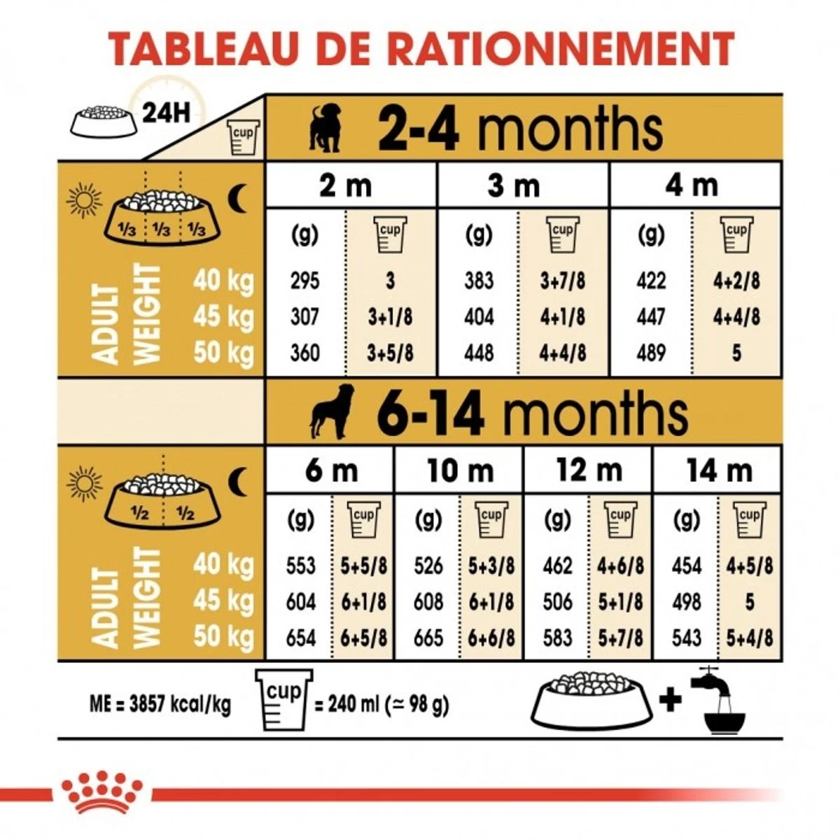 Royal Canin a développé ces croquettes Rottweiler 31 Junior avec pour objectif d’assurer la longue phase de croissance du chiot Rottweiler jusqu’à l’âge adulte, celle-ci s’étalant sur environ 18 mois. Pour cela, les croquettes sont composées des éléments suivants :