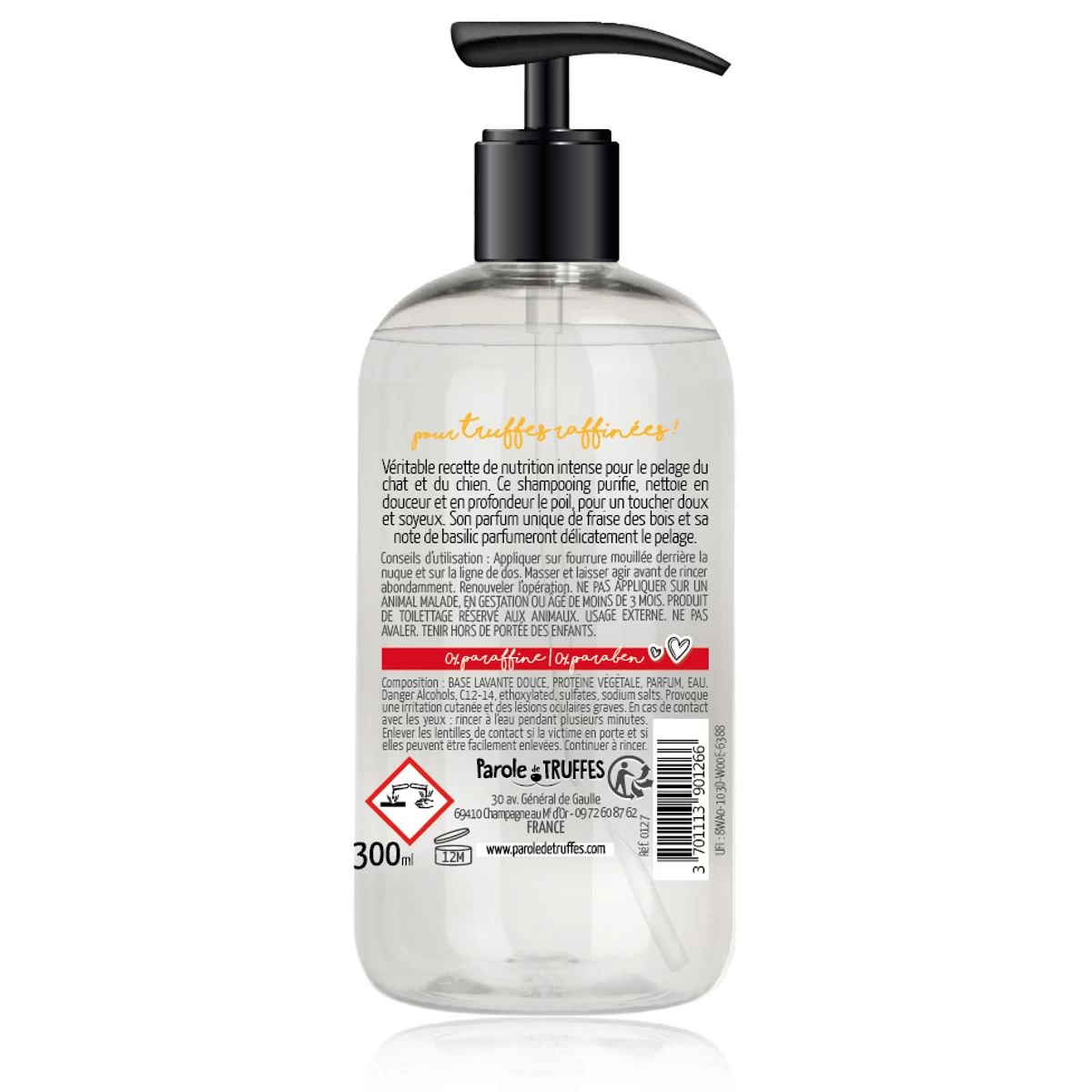 Succombez à ses senteurs fruitées de fraise des bois et ses notes de basilic, qui laisseront un parfum délicat sur le pelage de votre animal.